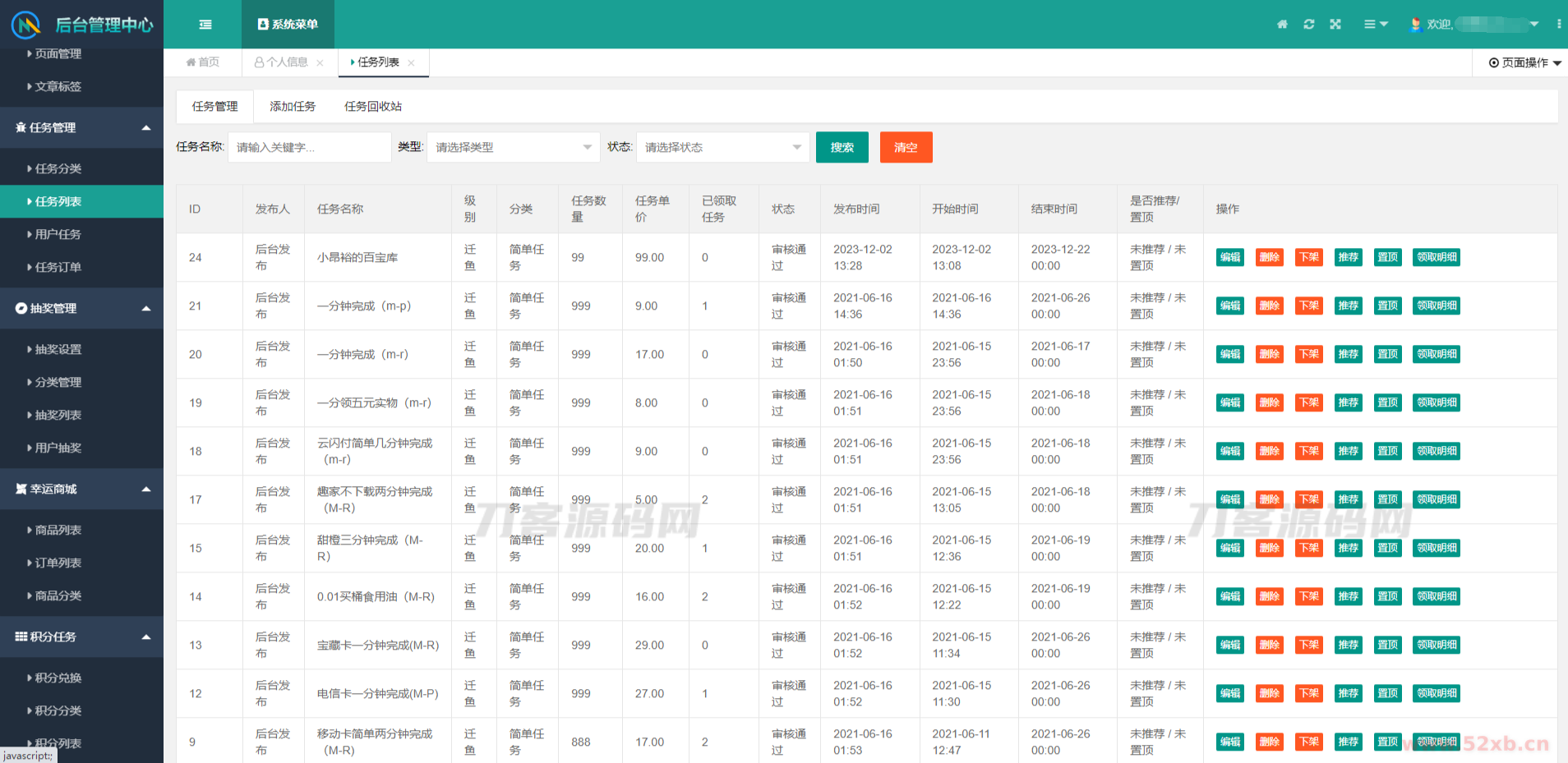 任务管理:包含平台的任务列表和用户任务列表,以及任务订单的相关管理。