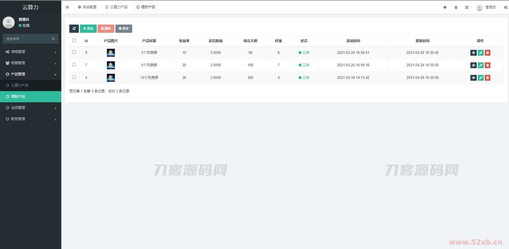 后台可添加理财产品 设置收益率 数量 天数