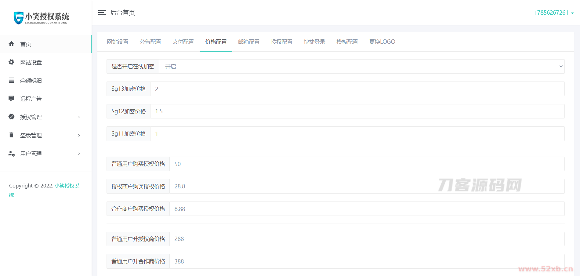 5、密价功能,每个用户可设置不同的授权价格(全网授权系统首发功能)