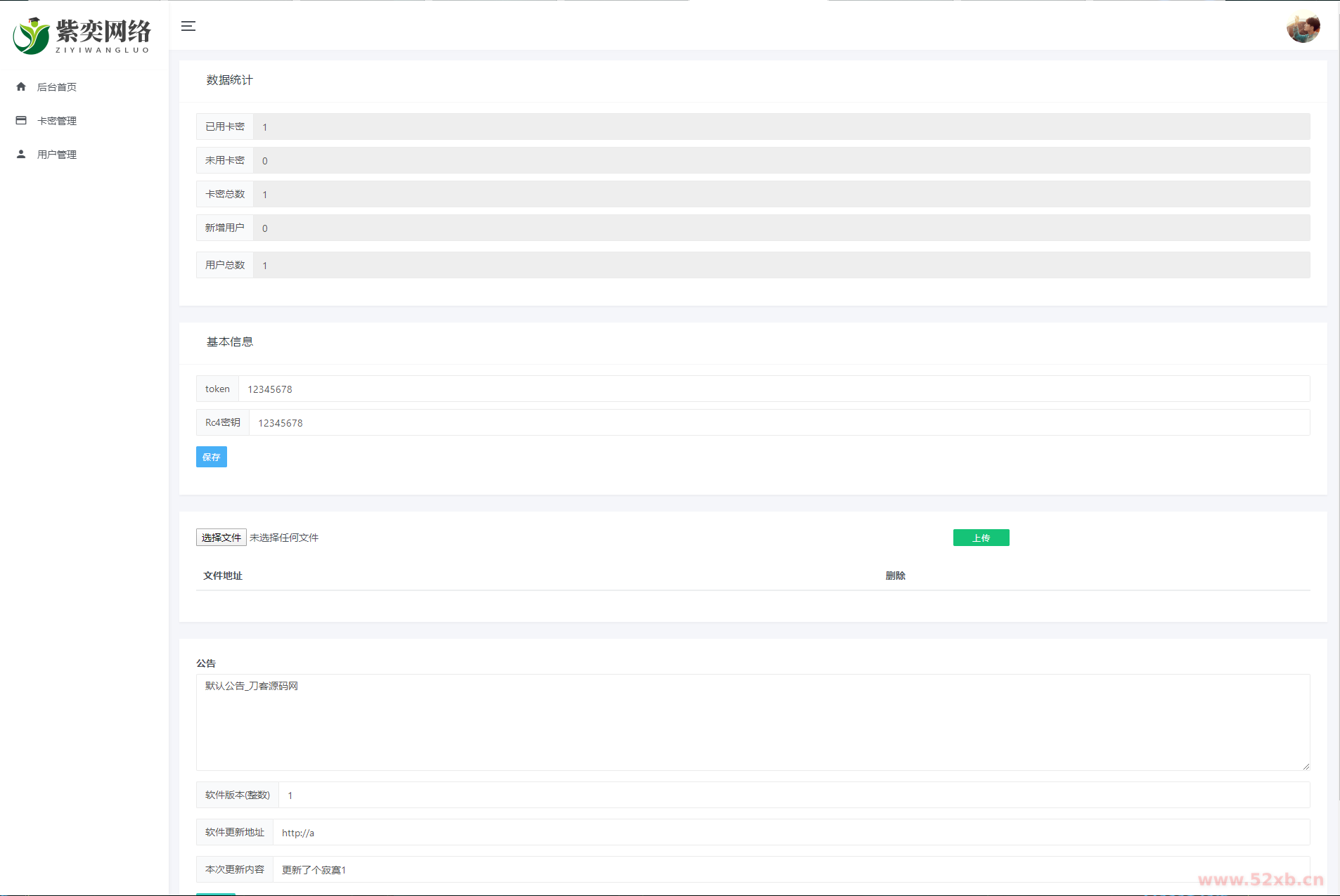 功能有 卡密系统 远程公告 远程更新 文件系统