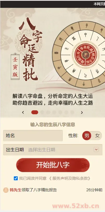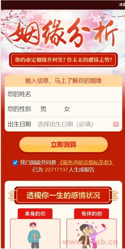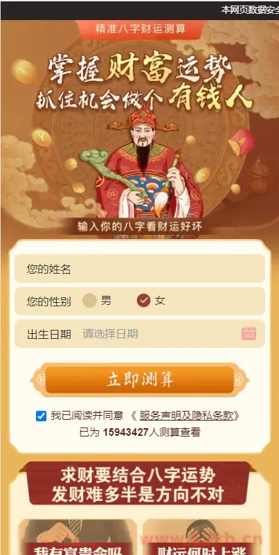 本源码为测算系统完整版,为网友提供的娱乐信息服务! 站长安装本源码后只要有人在线测算,就可以获得收入哦。