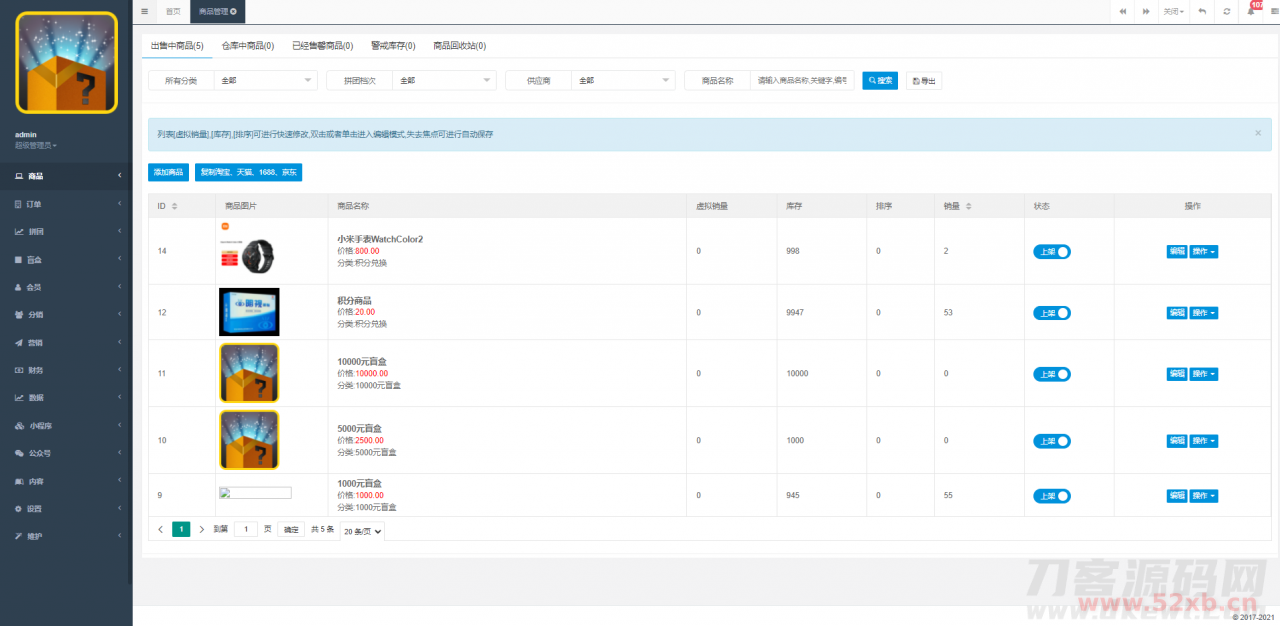 盲盒商品可以是哪些? 1.实物邮寄类商品,用户领取后填写地址,后台根据地址发货 2.核销卡券类商品,用户领取后获得兑换码,后台根据兑换码核销使用 3.应用内积分,盲盒里可以直接装入积分,用户中奖后直接领取到自己账户