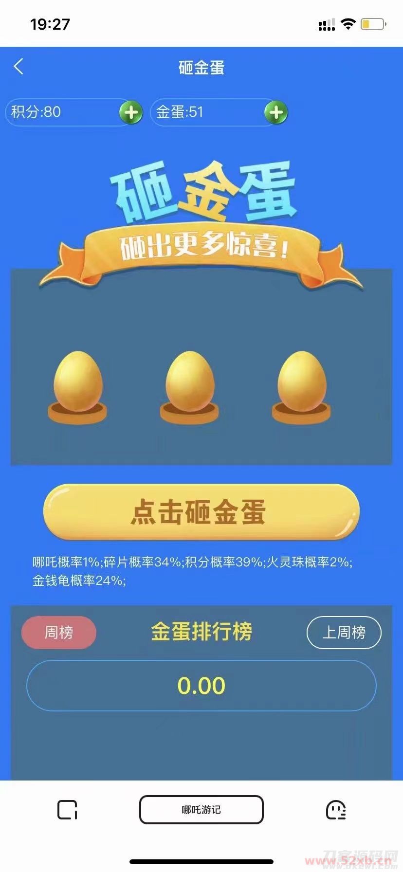 砸蛋可设置概率获得积分、哪吒、碎片、火灵珠、金钱龟。
