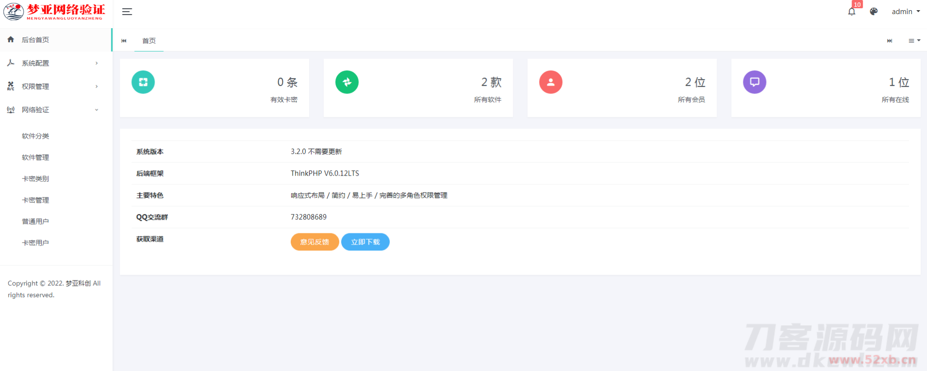 梦亚网络验证,基于thinkphp6.0+Bootstrap开发而成!后台管理系统是梦亚开发而成!网络验证功能也是梦亚开发而成!全量开源!
