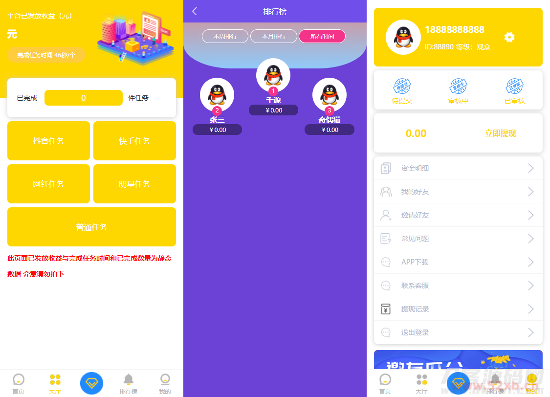 全修复运营版本的任务平台,支持垂直领域细分,定向导流,带有排行榜功能,任务发布上传审核,用户信用等级,充值接口等等均完美可用。