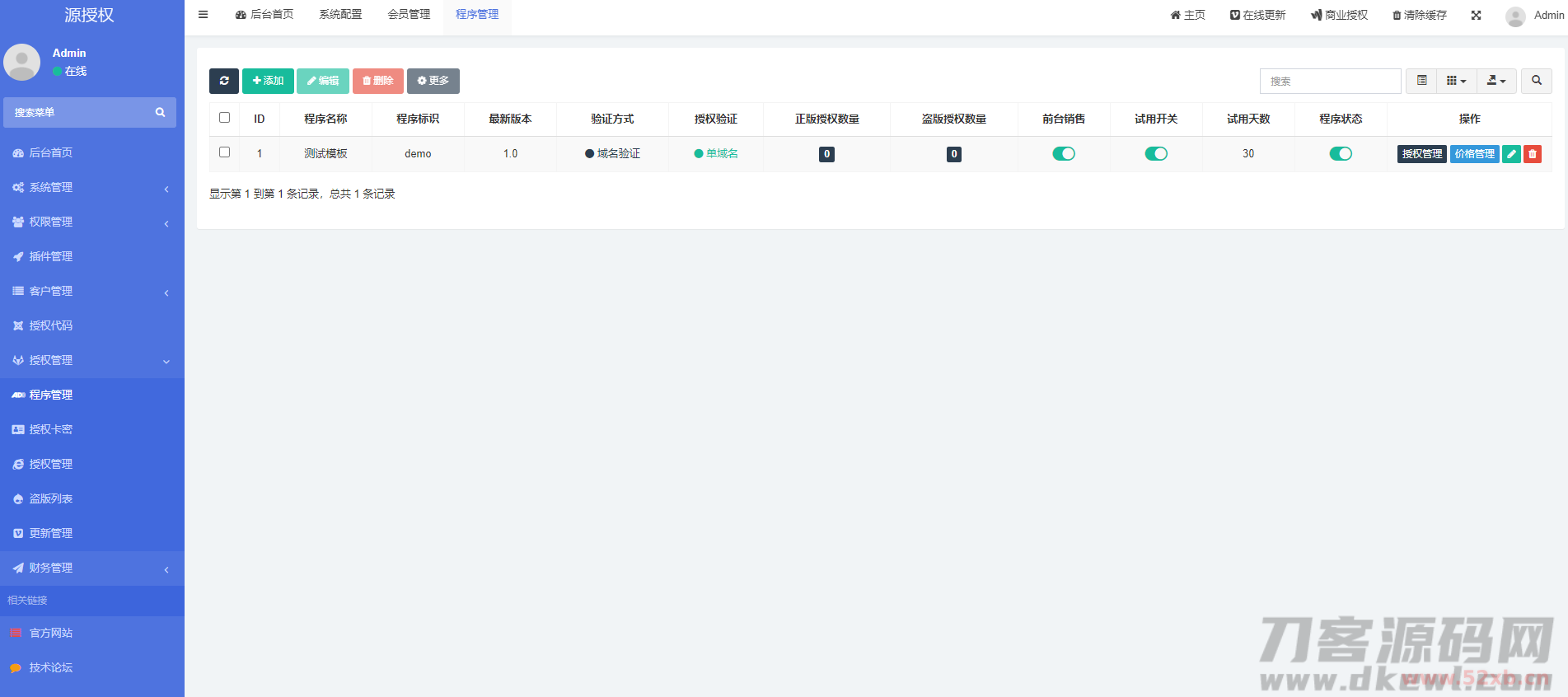 源授权是一款全新架构的授权系统.采用thinkphp 5.0开发,内置各种强大的功能,邮件管理,腾讯云短信、阿里云短信等.后台强大简洁,使用方便快捷,支付模块集成易支付功能,前台支持自助购买和操作管理授权!
