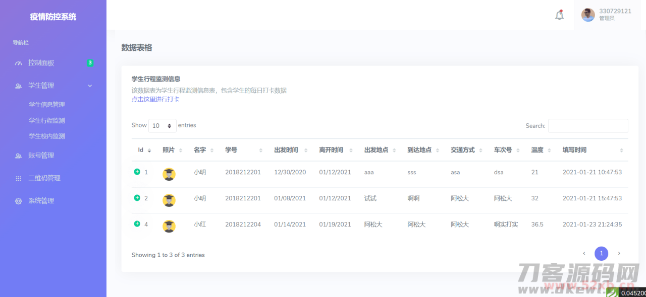 功能包括老师和学生角色权限,大数据图表展示,扫码进出校园,校园行程记录,生成二维码,学生管理,网站管理,学生签到打卡等功能等等。