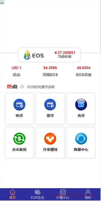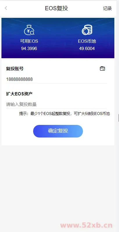 1、注册激活-复投(20个EOS激活:放大5倍资产)复投20个:即100个EOS,静态释放 5‰,每天释放0.5个;复投100个:即500个EOS,静态释放 5‰,每天释放2.5个;复投300个:即1500个EOS,静态释放 5‰,每天释放7.5个;