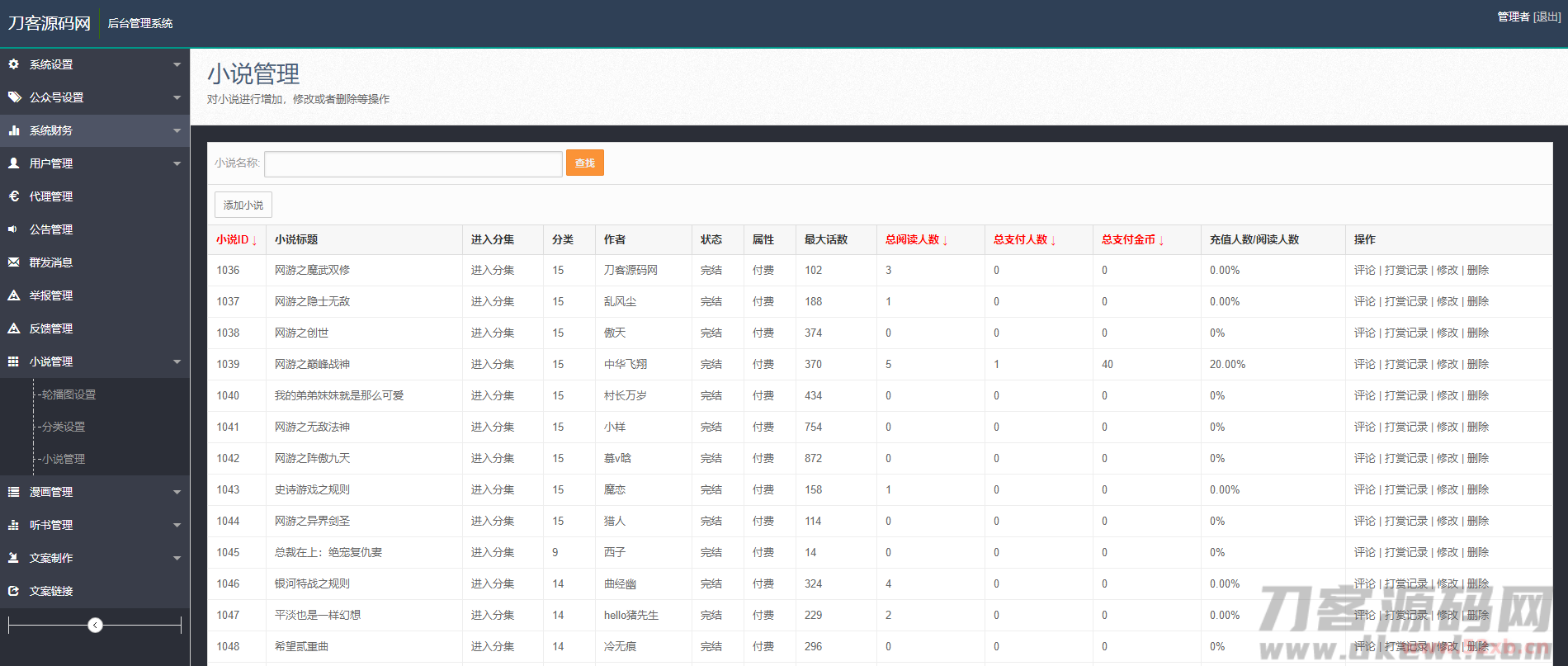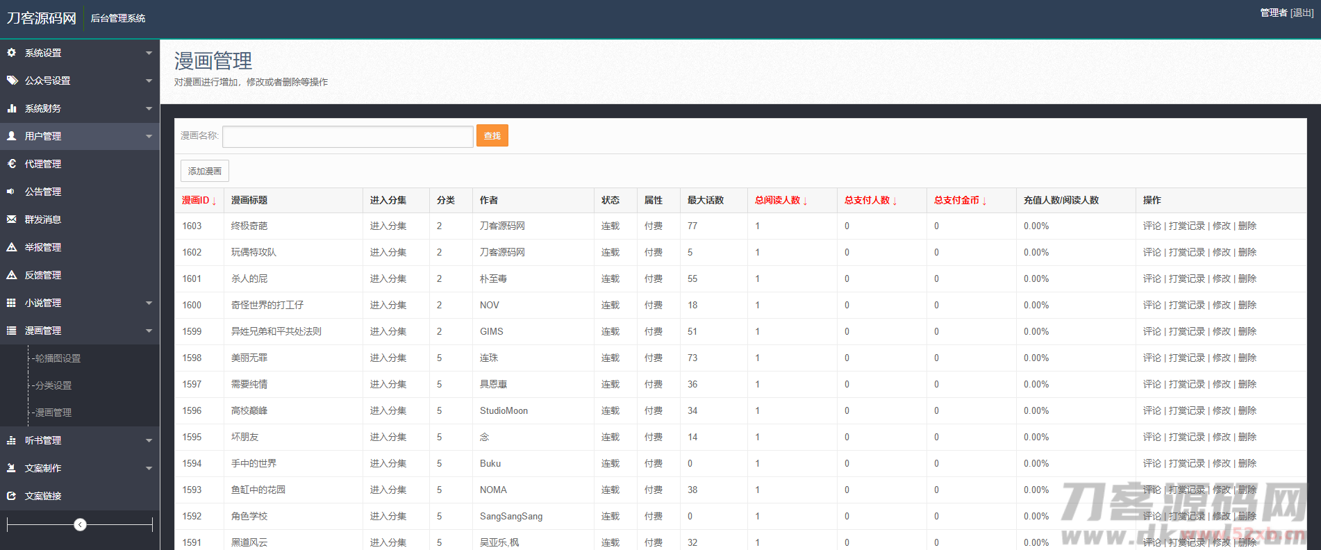 很多的站长都在找的源码,外面无错的也都卖到几K的,这里分享出来,并且修正了一些bug,可以链接一个第三方的影视站点(电影类的论坛发布了不少自己再搭建一个就可以),并且该小说、漫画、听书聚合手机网站还带有打赏功能,试看功能,接入第三方的支付。