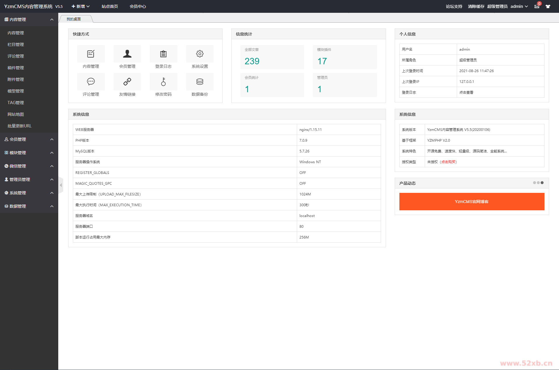 采用YzmCMS5.5框架,漂亮简洁大气。