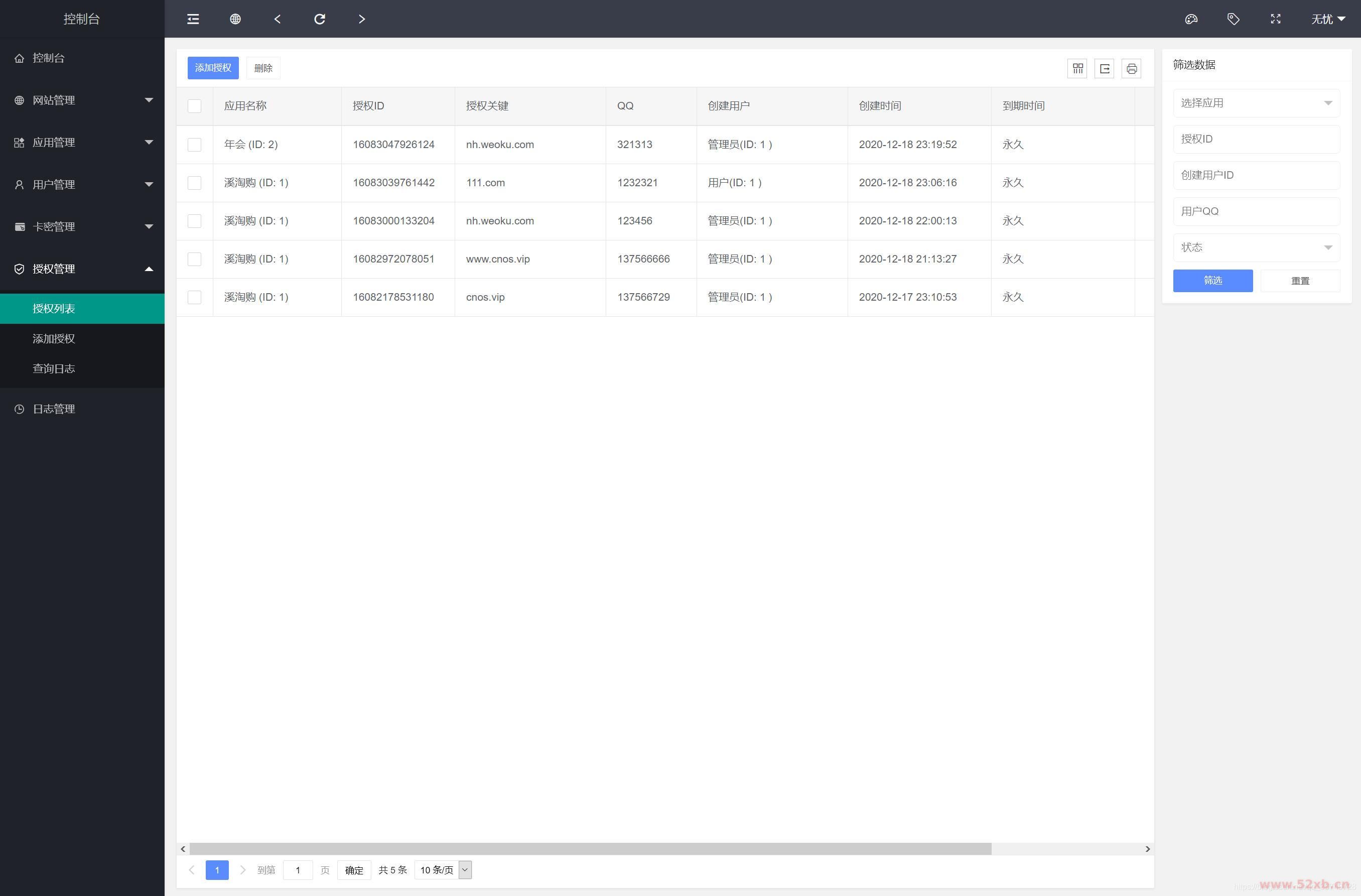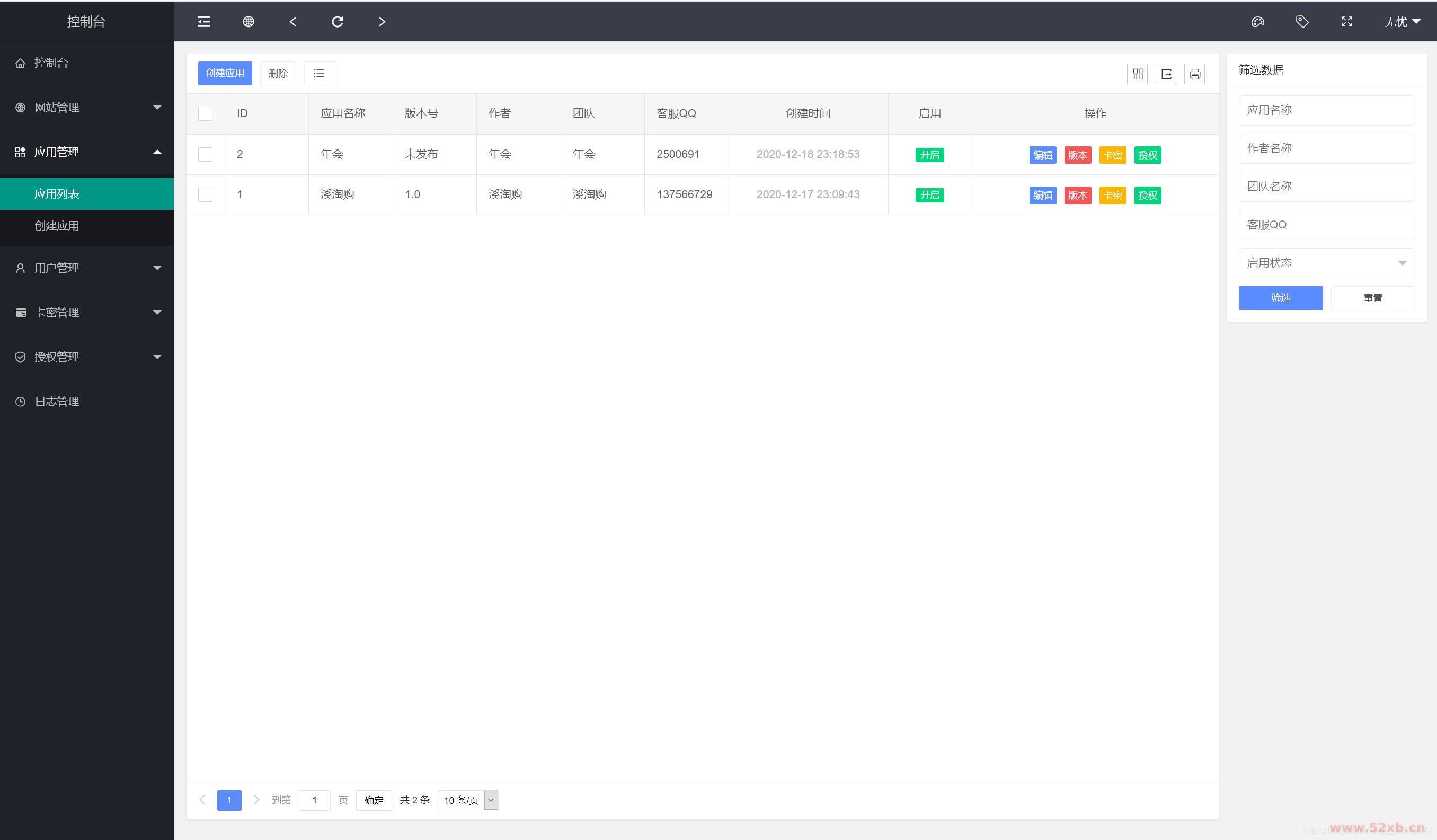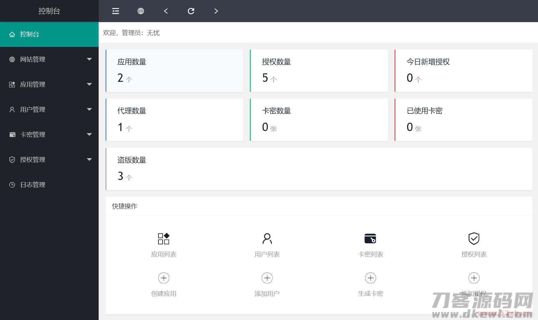 前台支持授权查询,卡密在线授权,代理查询,一级应用列表;