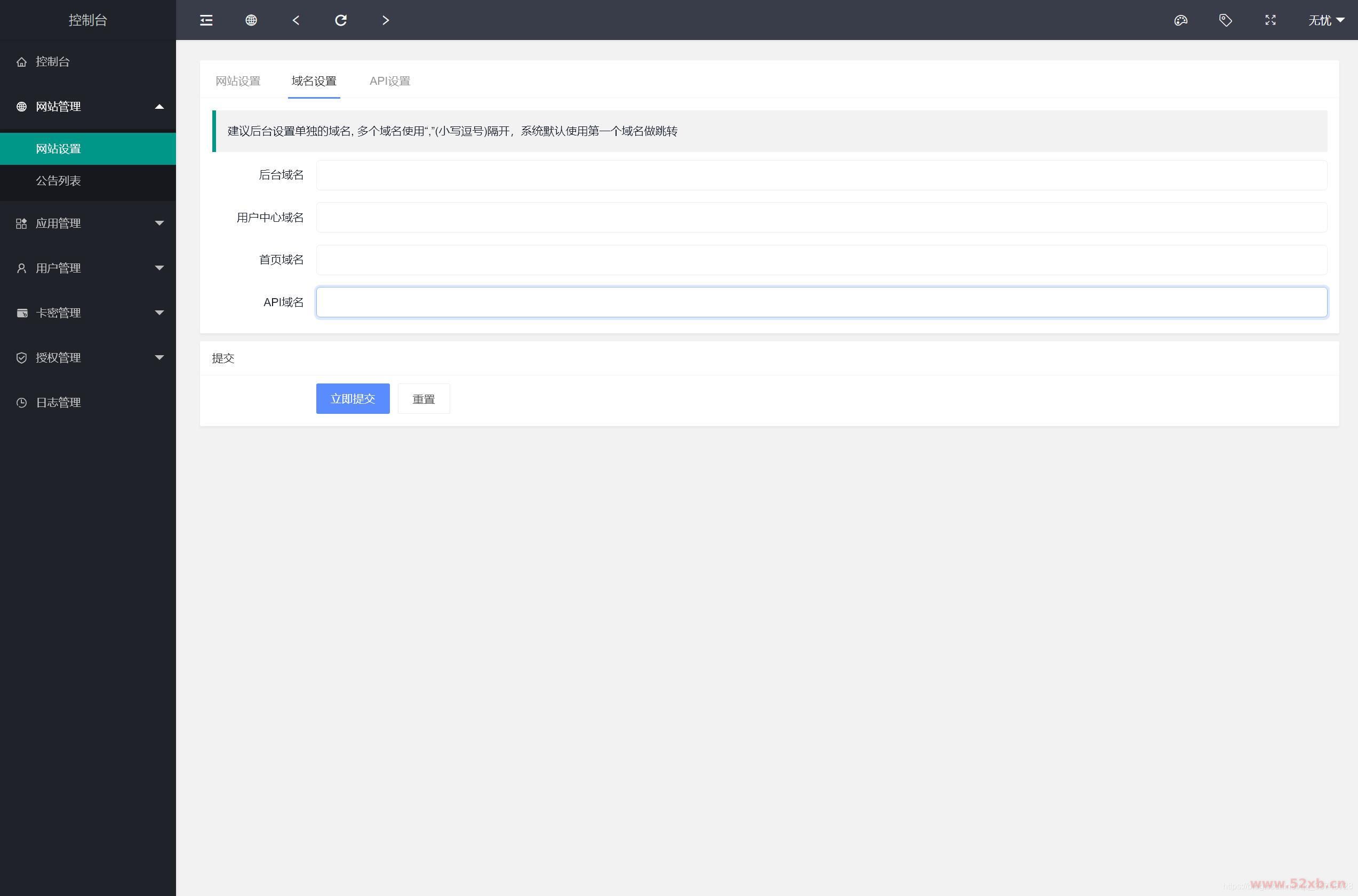 后台可以单独设置后台域名,用户中心域名,首页域名,API域名;