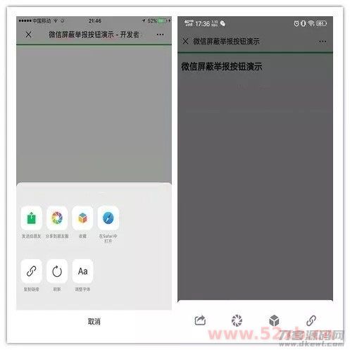 thinkphp框架开发屏蔽举报按钮代码,完全开源无加密,代码核心主要是屏蔽微信投诉按钮技术,全面兼容新(安卓/苹果)系统的微信app,也是市面上较新的微信域名防封技术之一