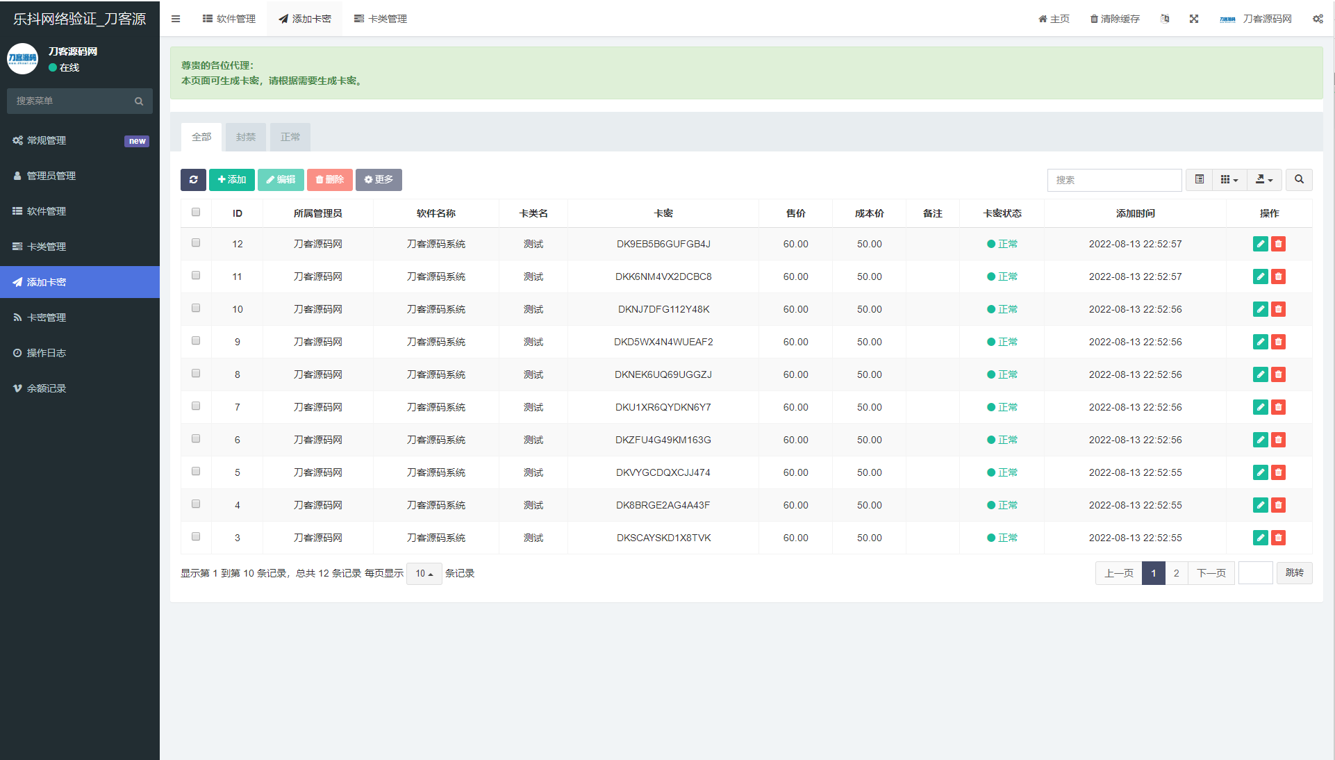 支持卡密时长可自定义,支持任意时长卡密,设置价格,代理拿货扣除余额