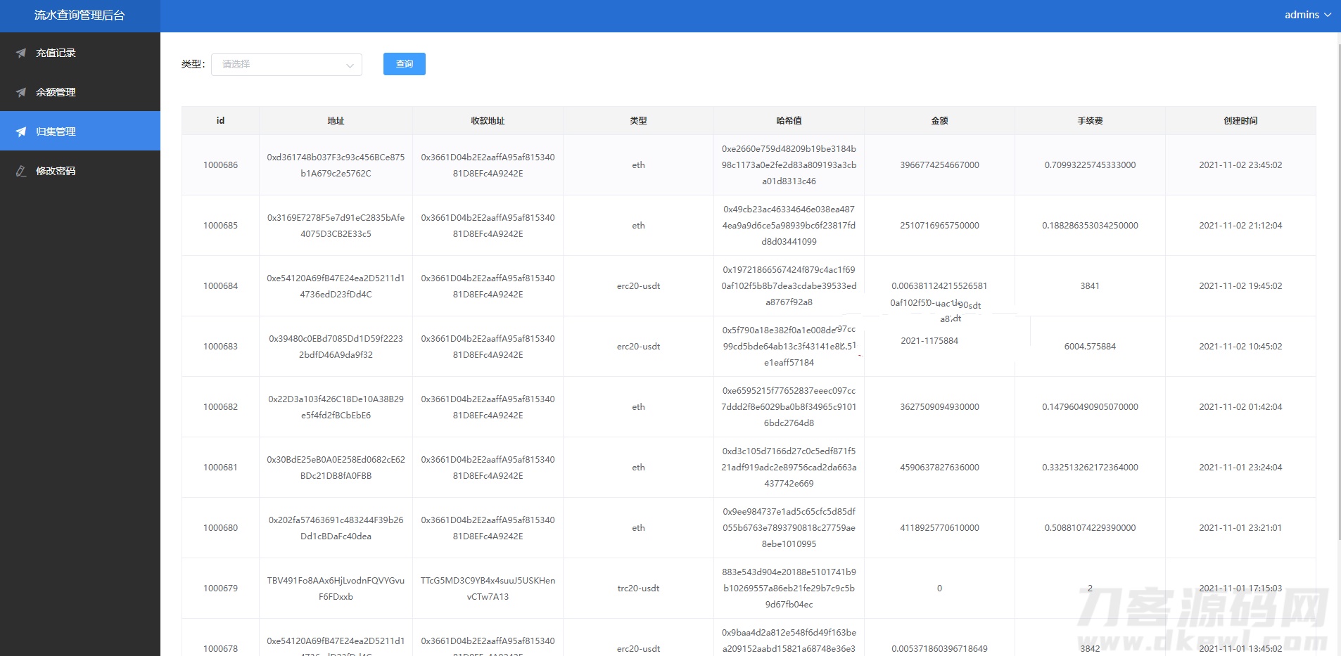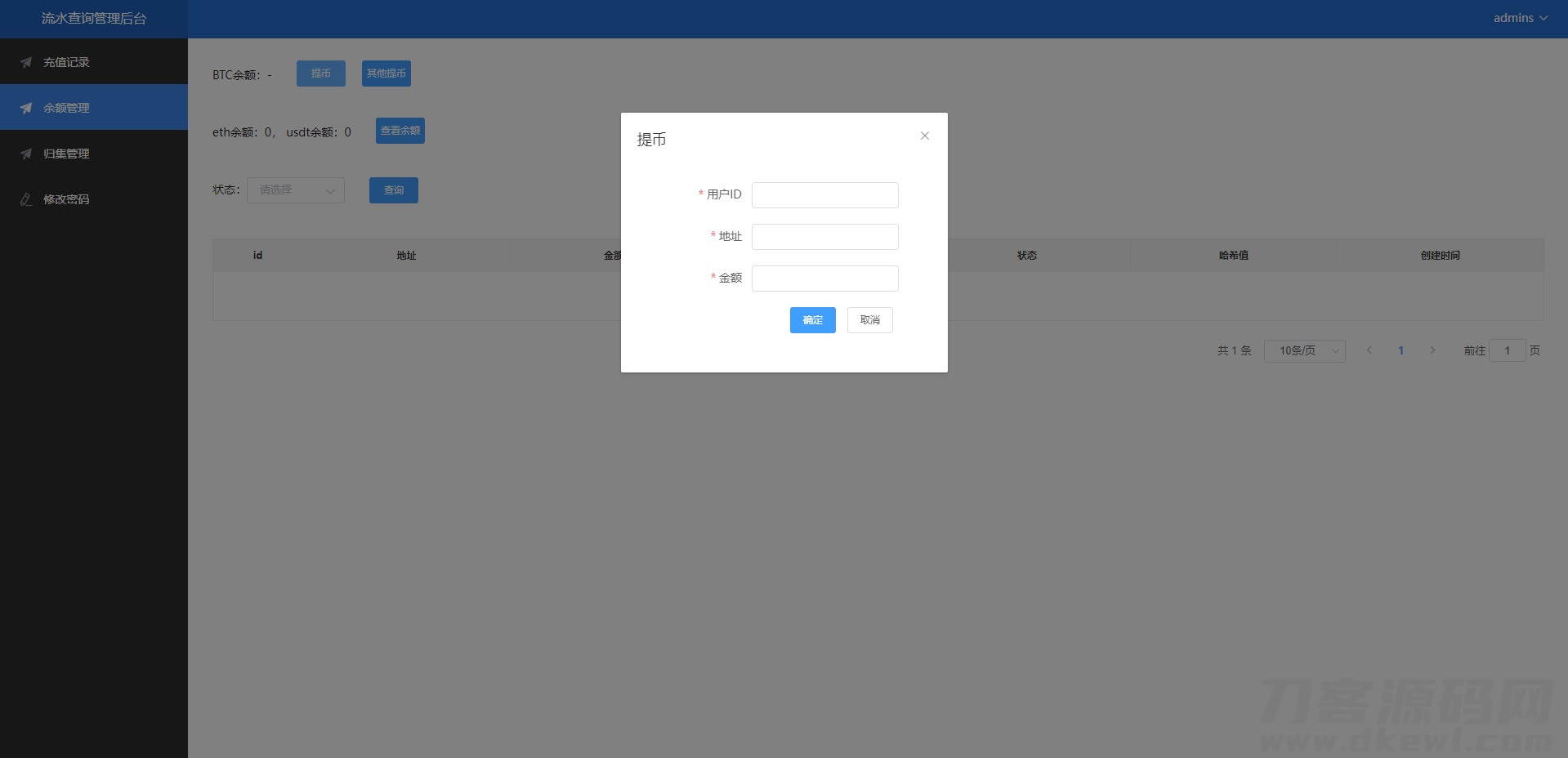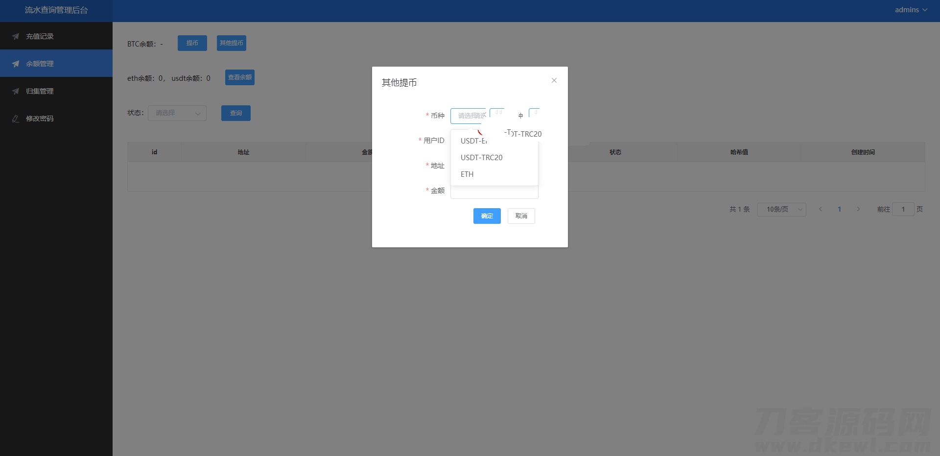 二开版流水查询系统/虚拟币查询多方式提币系统系统单独二开了提币,支持USDT-ERC20、USDT-TRC20、ETH方式提币支持单独地址余额查询,注意的是系统查询的API应该是对接第三方,现在不清楚能不能用了源码自行研究