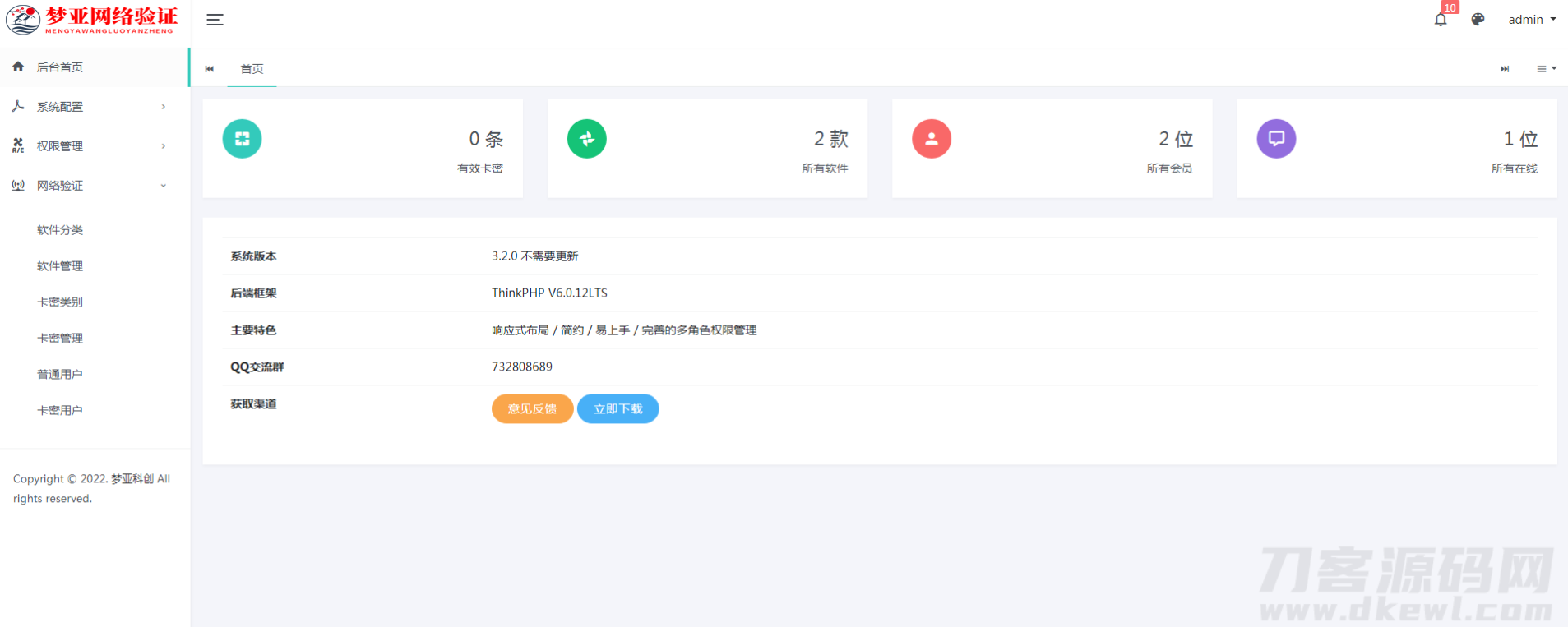 梦亚网络验证,基于thinkphp6.0+Bootstrap开发而成!后台管理系统是梦亚开发而成!网络验证功能也是梦亚开发而成!全量开源!