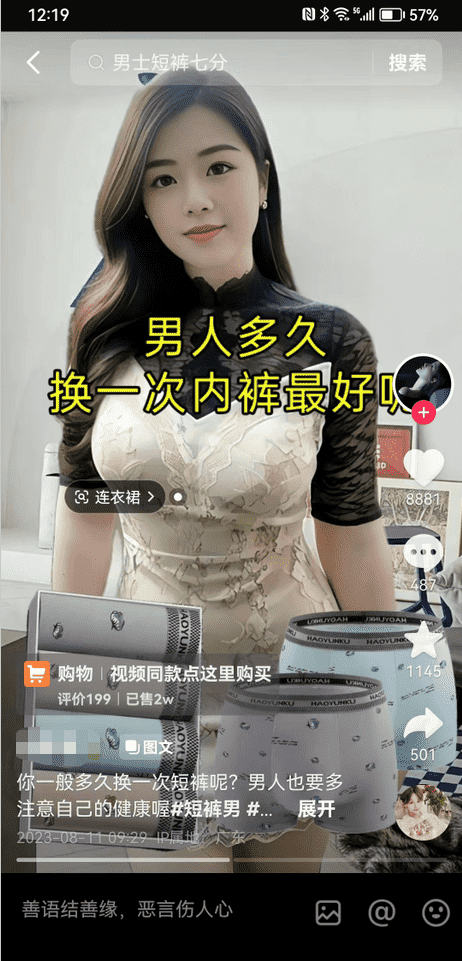 抖音AI中年美女图文带货,非常暴力的新玩法,一个视频500万播放量,直接挂男士内裤链接赚佣金不用囤货,作品制作也简单